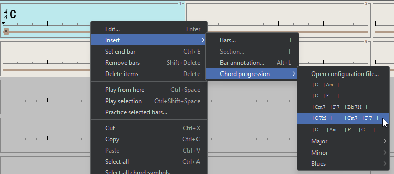 Define your own chord progressions and easily insert them. Chord progressions are defined in a simple text file located in your JJazzLab user directory. You can customize the file as you wish to edit and organize chord progressions.