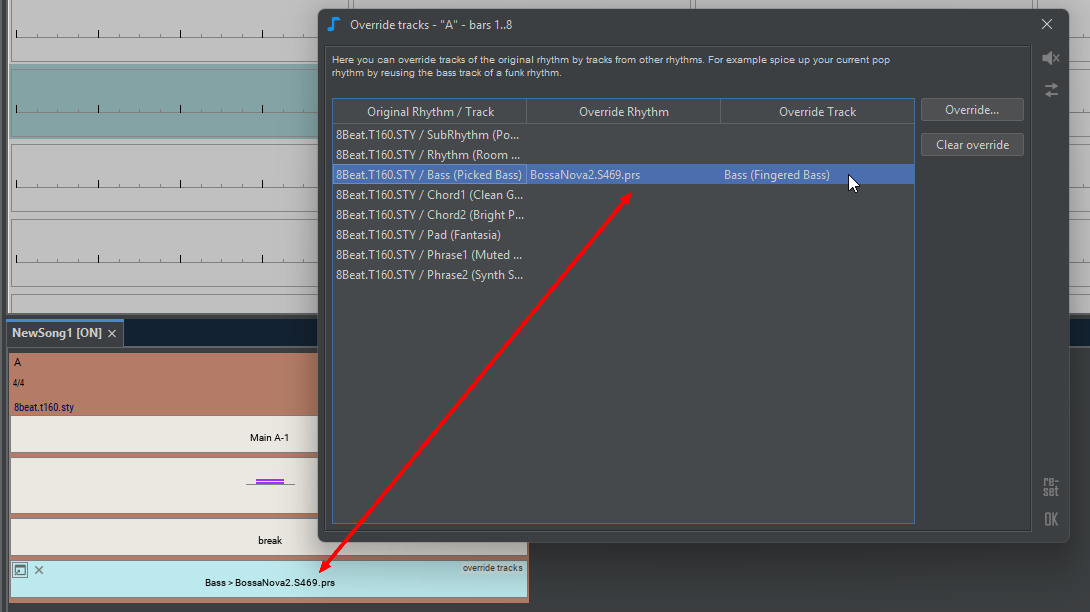 This new rhythm parameter lets you use tracks from different rhythms/styles. In the image below we override the 8beat.t160.sty bass track by a bossa-nova track.